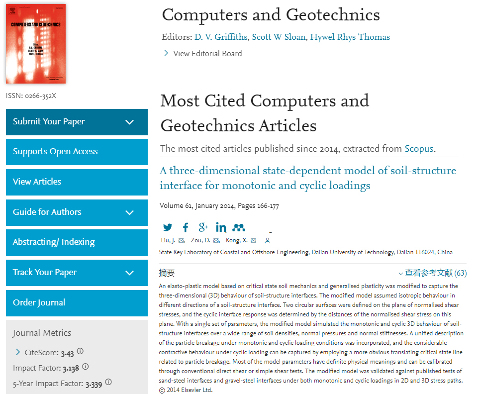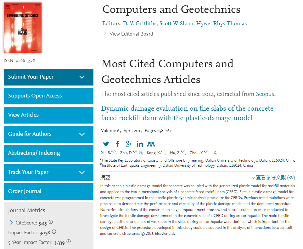 徐斌副教授完成的论文“Dynamic damage evaluation on the slabs of the concrete faced rockfill dam with the plastic-damage model”、 刘京茂副教授完成的论文“A three-dimensional state-dependent model of soil-structure interface for monotonic and cyclic loadings” 均被列为Computers and Geotechnics期刊近5年Most Cited Articles(统计自2014年以来)。Computer and Geotechnics的Most Cited Articles共25篇。